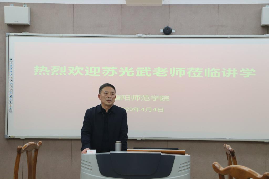 为进一步传承和弘扬中华民族优秀传统文化,培养大学生对书法的兴趣,修身养性、陶冶情操,不断提升美学修养。4月4日下午,应学校学生工作部(处)与教师教育学院的邀请,中国书协会员、信阳市书协副主席苏光武老师莅临教师教育学院,开展了题为《书法审美与修身养性》的讲座,学校大学生心理健康教育中心主任、学生工作处副处长李贵杰,学院党委副书记王艳蕊、副院长李文田以及部分学生参加讲座交流。