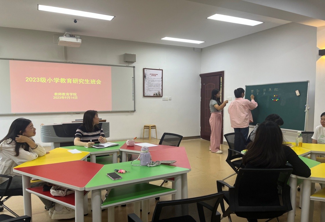 为形成良好学风班风,建设奋发向上、团结友爱的班集体,2023年9月14日,教师教育学院在教七楼402室举行了2023级小学教育研究生班会暨班委竞选活动。本次活动由研究生秘书兼辅导员常燕燕老师主持,2023级小学教育全体研究生积极参与。