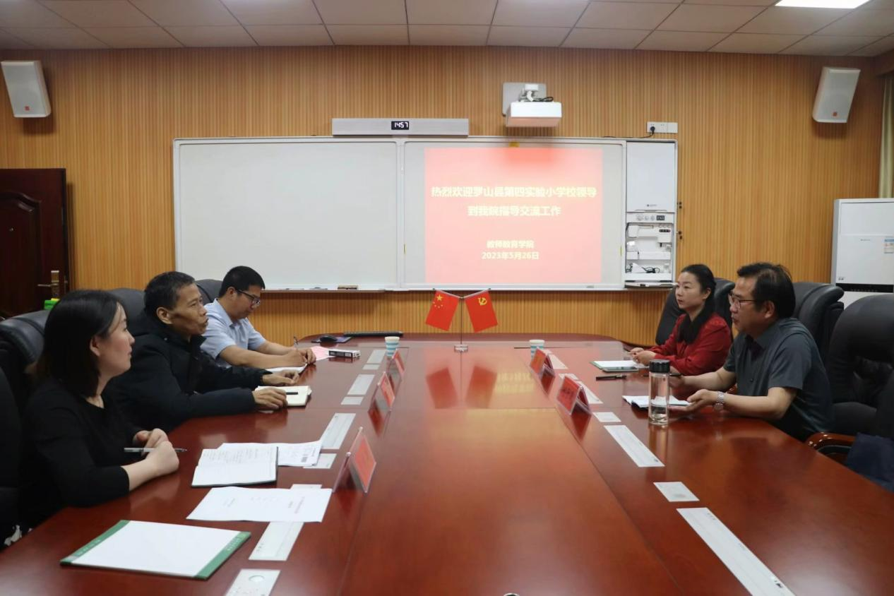 5月26日下午,罗山县第四实验小学校长何子斌、副校长万丽到我院就实践教学基地建设和双方合作教育等相关领域进行考察交流。教师教育学院院长付永昌在教七楼301会议室接待了来访客人,实践教学中心、研究生工作相关教师代表参加了座谈会。
