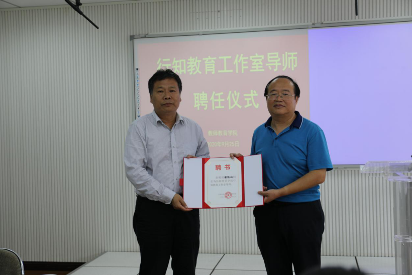 9月25日,教师教育学院行知教育工作室导师聘任仪式在教七楼501举行,聘任开封市基础教育教研室谢铁山为工作室导师。教师教育学院付永昌院长为谢铁山颁发聘书并合影留念。聘任仪式由连亚飞博士主持。