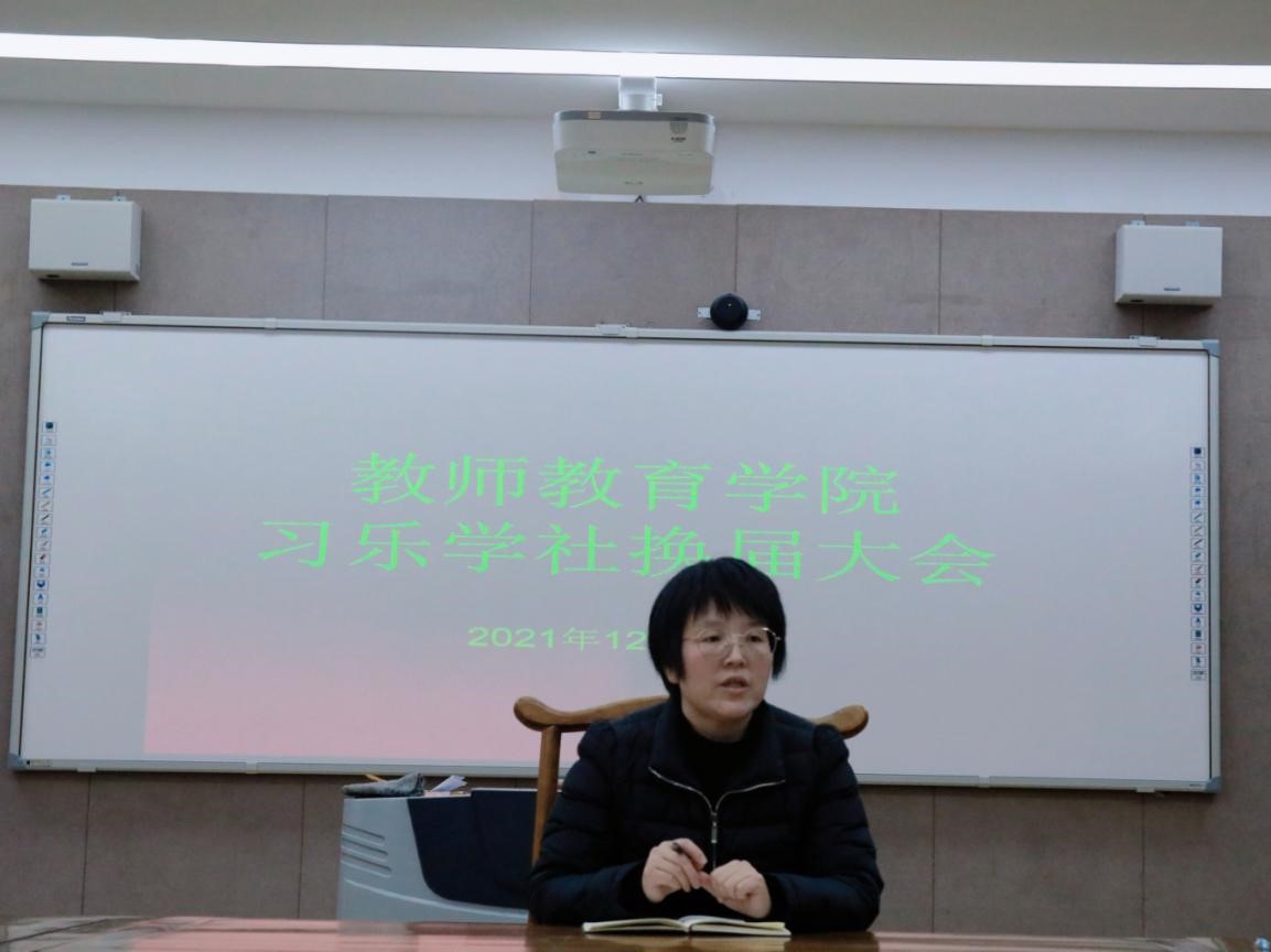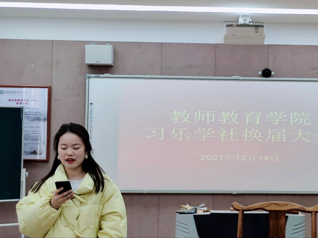 12月14日,教师教育学院习乐学社第四届换届大会在教七楼201教室顺利举行,习乐学社指导教师谭阿明参加本次会议。会议由习乐学社社长高鸽主持。