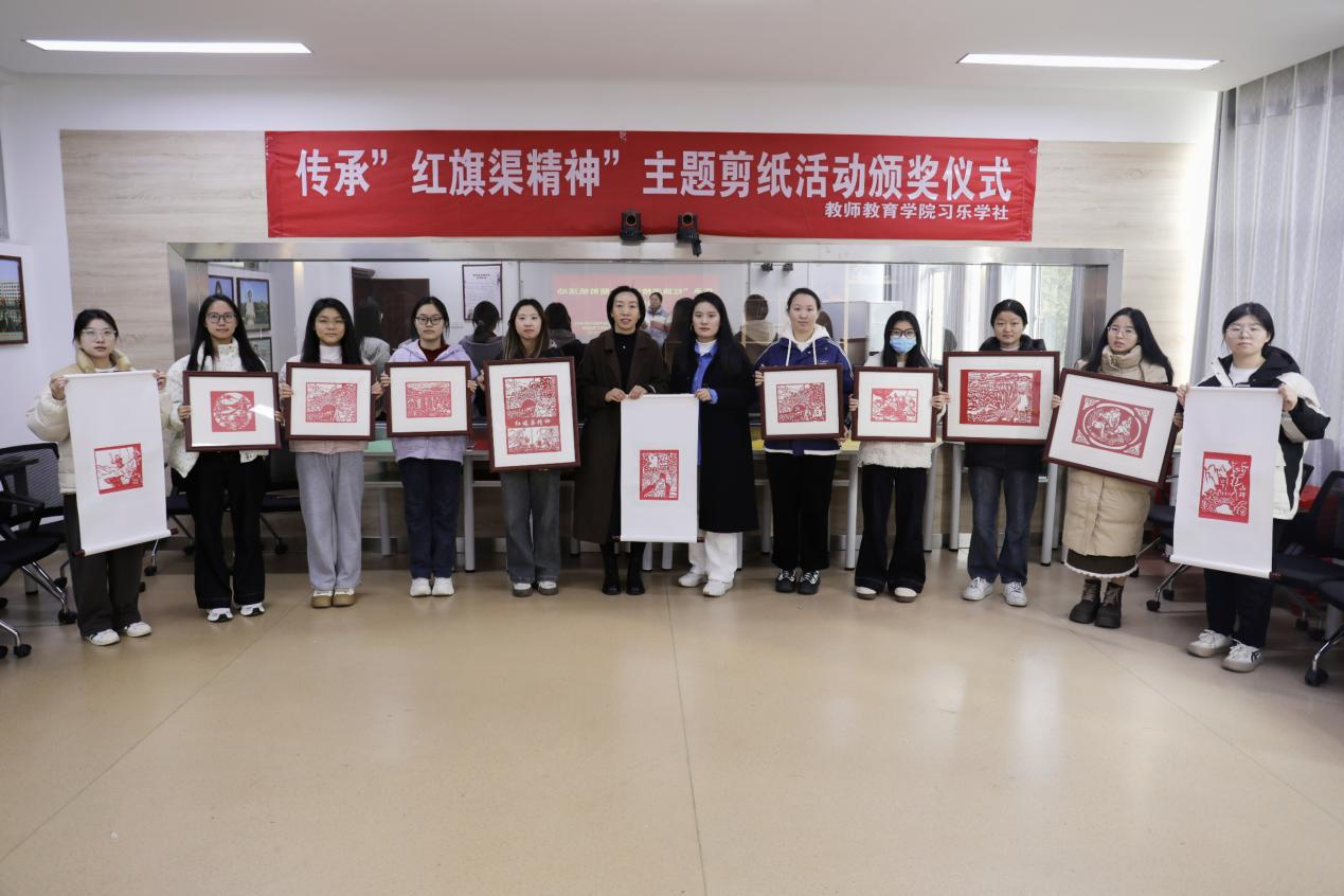 11月25日,由教师教育学院习乐学社主办的传承“红旗渠精神”主题剪纸活动颁奖仪式在教七楼402教室顺利举行。此次比赛采取线下征集作品的形式,全校近60人参与。学院党委副书记王淑贤、教师康文慧及获奖人员参加颁奖仪式。