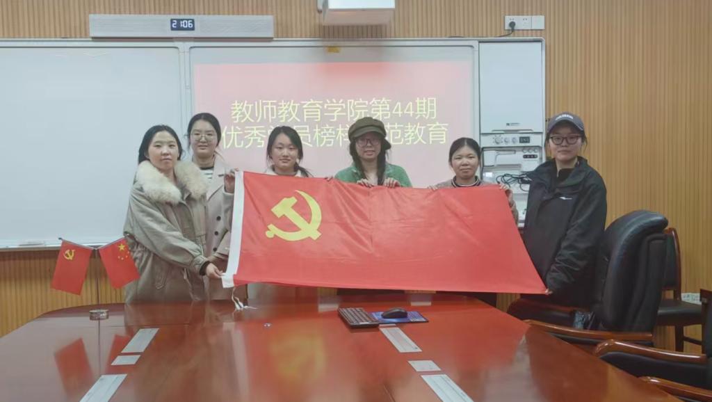 10月25日,教师教育学院于教七楼301会议室组织开展优秀学生党员榜样示范教育活动,学院优秀学生党员李瑶和王松勇为第44期党员发展对象进行宣讲。此次活动由陈昱洁主持。