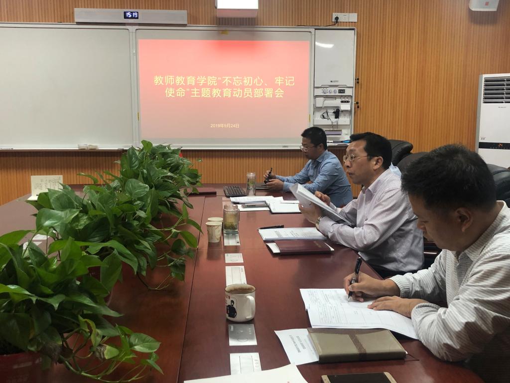 为认真贯彻习近平总书记在“不忘初心、牢记使命”主题教育工作会议上的重要讲话精神,认真落实《关于印发<中共信阳师范学院委员会关于开展“不忘初心、牢记使命”主题教育的实施方案>的通知》文件精神,9月24日,我院“不忘初心、牢记使命”主题教育动员部署会在教七楼301会议室举行。我院党委副书记潘登、副院长付永昌等全体党员参加此次会议,会议由潘登主持。