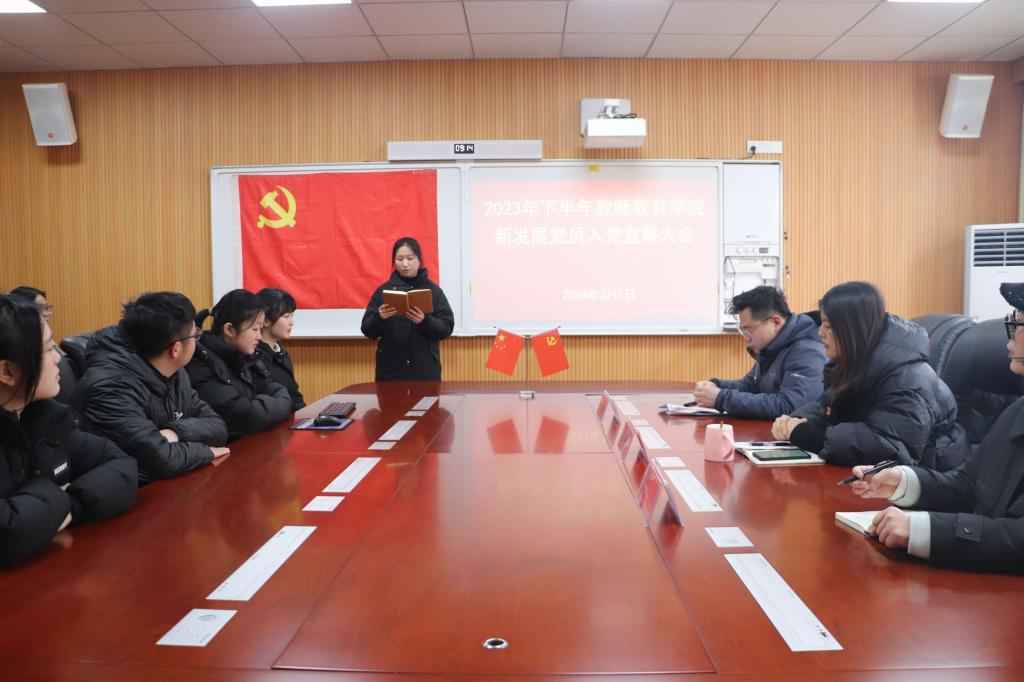 3月1日上午,教师教育学院在教七楼301会议室举行了2023年下半年预备党员宣誓大会。学院党委副书记王艳蕊、学生第一党支部书记李杨、学生第二党支部书记姚雨承,第三十八期学生党员和第四十期学生预备党员到场参会。会议由姚雨承主持。