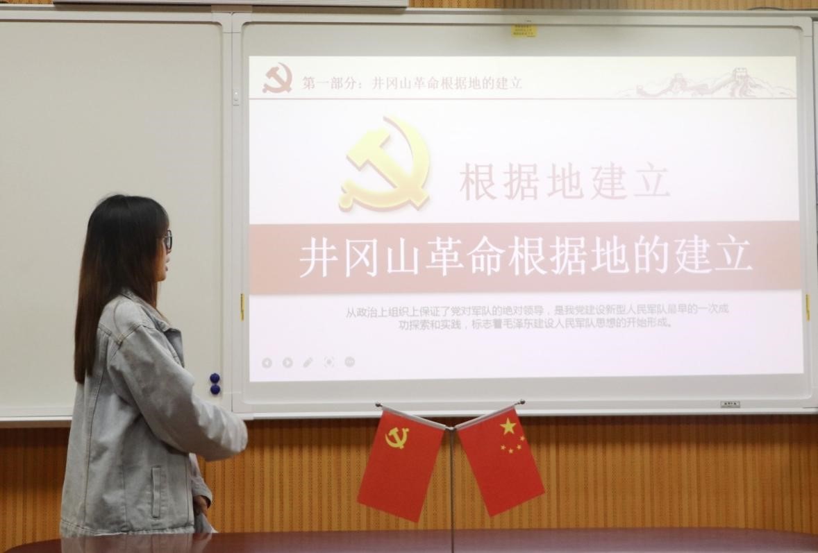 会议伊始,优秀党员发展对象高鸽以“不忘初心,继续前行”为主题,依据史实,围绕历史文化和时代内涵两方面对井冈山革命根据地进行分享,并号召在场党员发展对象以前辈为榜样,在先锋模范精神的感召下,用新媒体让井冈山精神在新时代放射新光芒。王子欣以柴静《看见》一书中的“抗击非典”事例为切入点,结合“抗击非典”中的代表人物事件,宣讲了“临危不惧、万众一心”的抗非精神。她谈到,一次次的交流分享已将先锋模范基因融入了在场发展党员对象的血脉之中,抗非精神也随之衍生发展。陈钊做了题为“弘扬五四精神,做新时代有为青年”的发言。他从现实意义的角度对五四精神进行了着重分析,并向在场党员发展对象提出方向要明、品格要高、干劲要足的三点实际性建议。其他学生亦分别从不同的角度积极发言,阐述抗疫精神、五四精神等时代精神的内涵。最后,全体学生党员发展对象在党旗前合影留念。