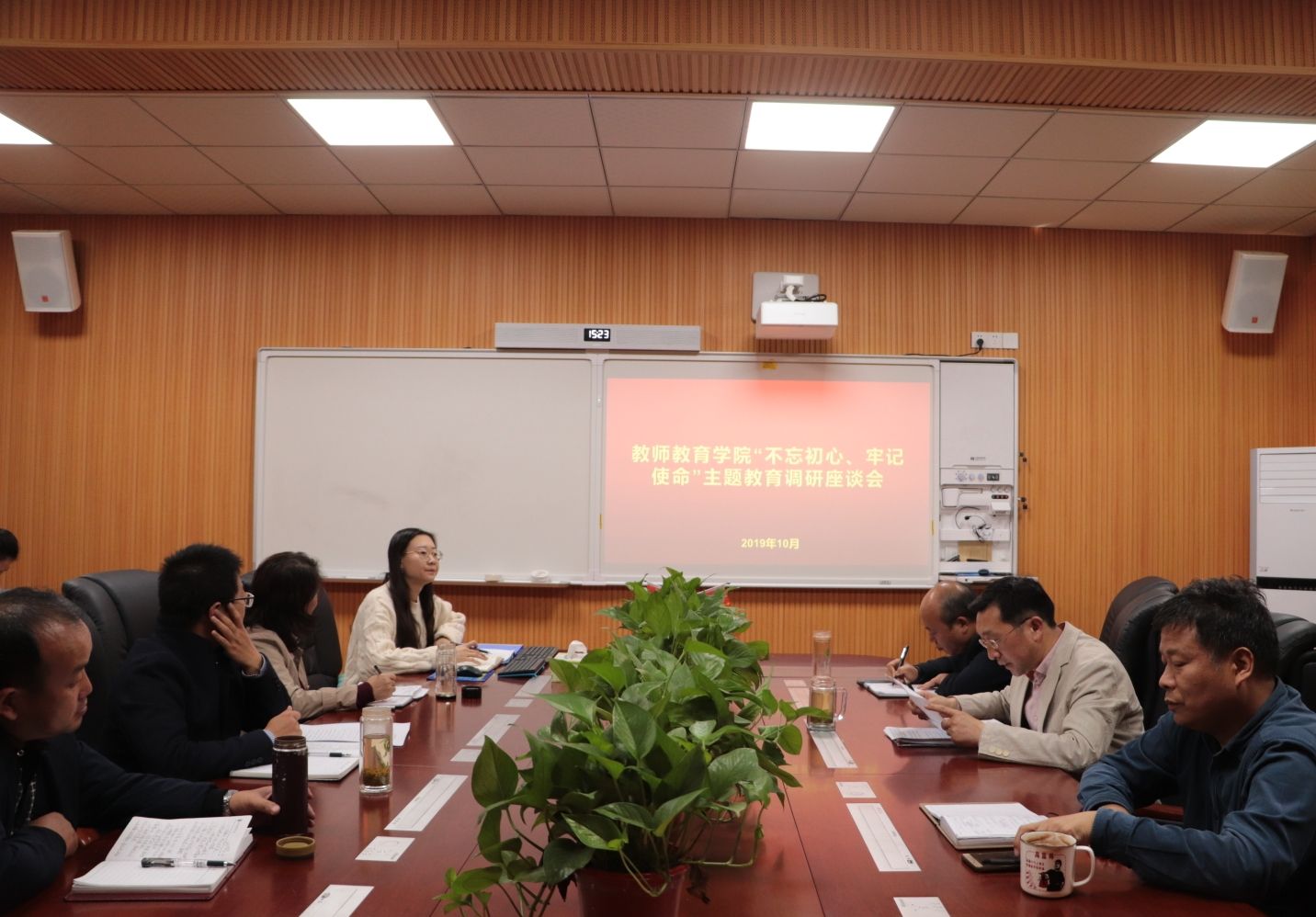 近期,根据校党委“不忘初心、牢记使命”主题教育要求,教师教育学院结合学院工作实际选取课题,深入开展调研活动。10月15日,学院在教七楼301会议室召开“不忘初心、牢记使命”主题教育调研座谈会,学院党委副书记潘登、副院长付永昌出席、教职工党员参加调研座谈。此次会议由潘登主持。