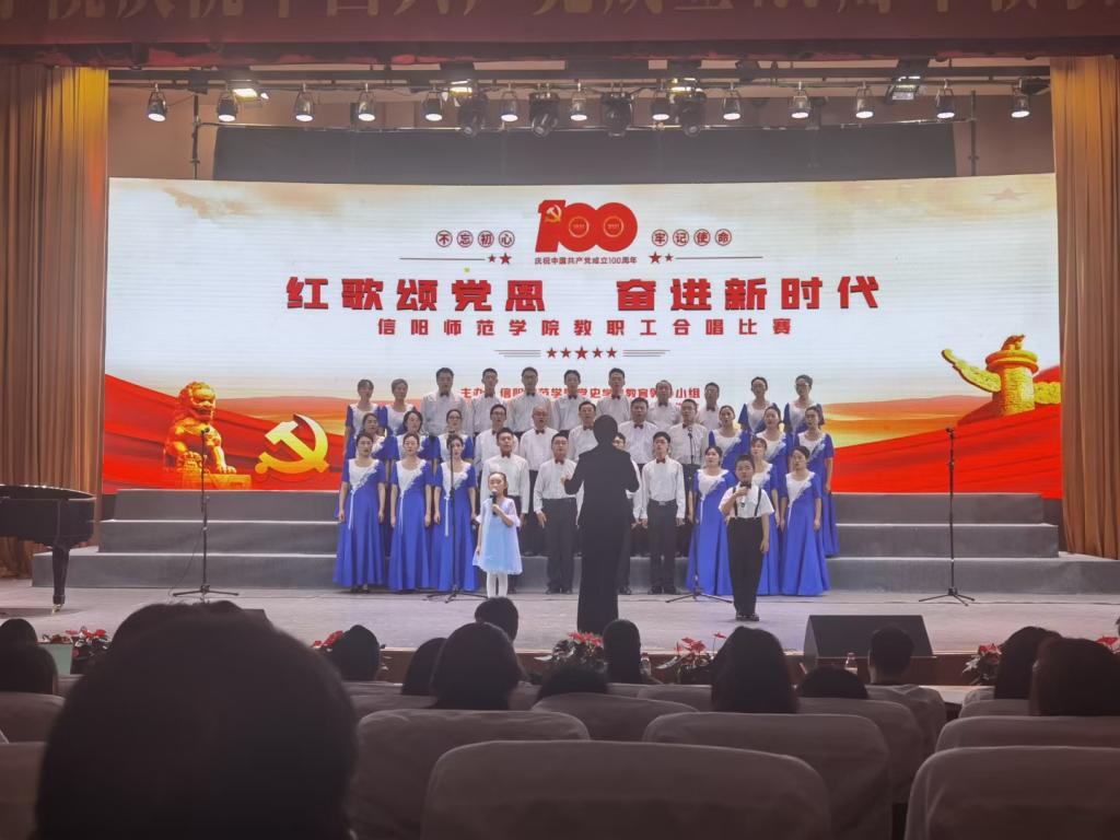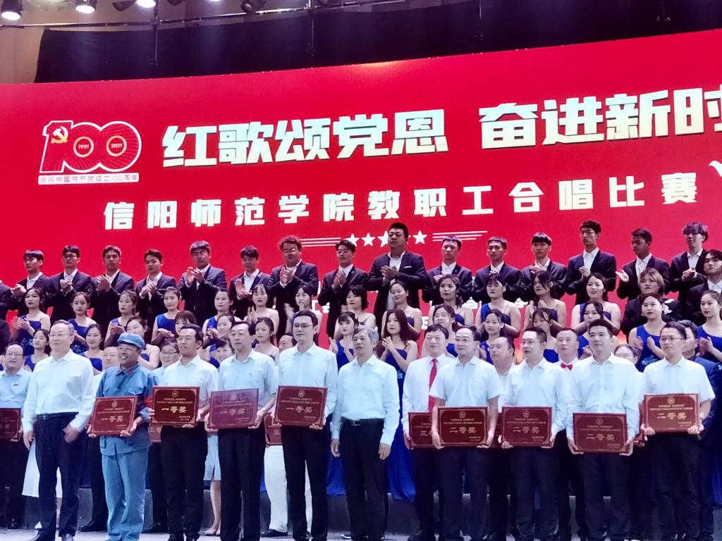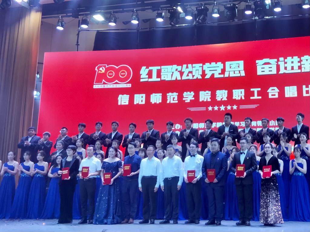 为庆祝中国共产党成立一百周年,讴歌党的丰功伟绩,礼赞新时代取得的伟大成就,激发教职工们的昂扬斗志,用嘹亮歌声表达跟共产党走的坚定决心,6月22日下午,由信阳师范学院主办,校工会和音乐与舞蹈学院承办的教职工合唱比赛在艺术楼音乐厅圆满落幕。校党委书记王文鹏,校长李俊,校党委副书记郜火星,校党委副书记、工会主席王文臣,副校长刘彦明,校纪委书记、监察专员龚立新,副校长陈登报、余本海、王金云、胡海华、郑云等出席此次活动。由院党委副书记潘登带领的教师教育学院教职工合唱团在此次活动中荣获一等奖。