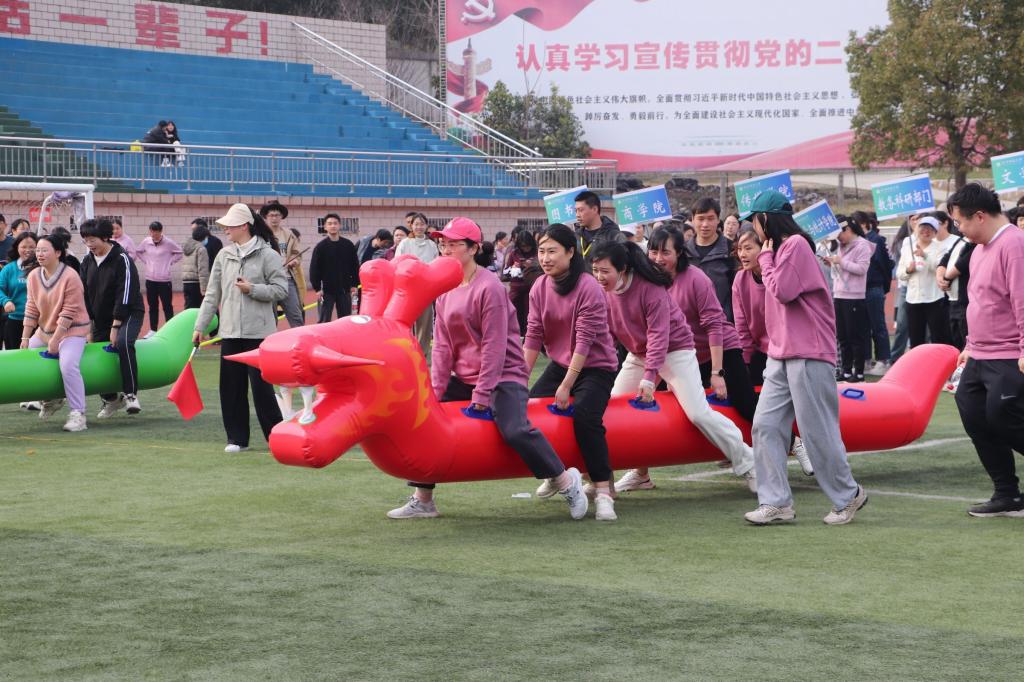 运动会上,校党委书记王文鹏致开幕词,向全体女教职工致以节日的问候和美好的祝愿。校党委副书记、工会主席岳宗德宣布本次趣味运动会开幕。在比赛正式开始前,参加比赛的教师在场地内跳起健身操,积极热身,为本次比赛做好充分准备。本次运动会设有拔河、袋鼠接力、旱地龙舟、旋风跑等团体项目,趣味性和协作性为一体,现场气氛既妙趣横生又紧张激烈。各支队伍积极参赛,充分发挥了团结协作、奋力拼搏的精神,尽显巾帼风采。在拔河比赛中,我院教师热情高涨,个个精神抖擞,随着裁判员一声令下,教师们个个双手紧握长绳,憋足气、鼓足劲,所有人的心凝聚在一条绳索上。赛场上欢呼声、喝彩声不绝于耳,洋溢着欢乐的气氛。我院教师队伍在本次趣味运动会上表现优异,在旱地龙舟、旋风跑两个项目中均进入八强,学院荣获优秀组织奖。