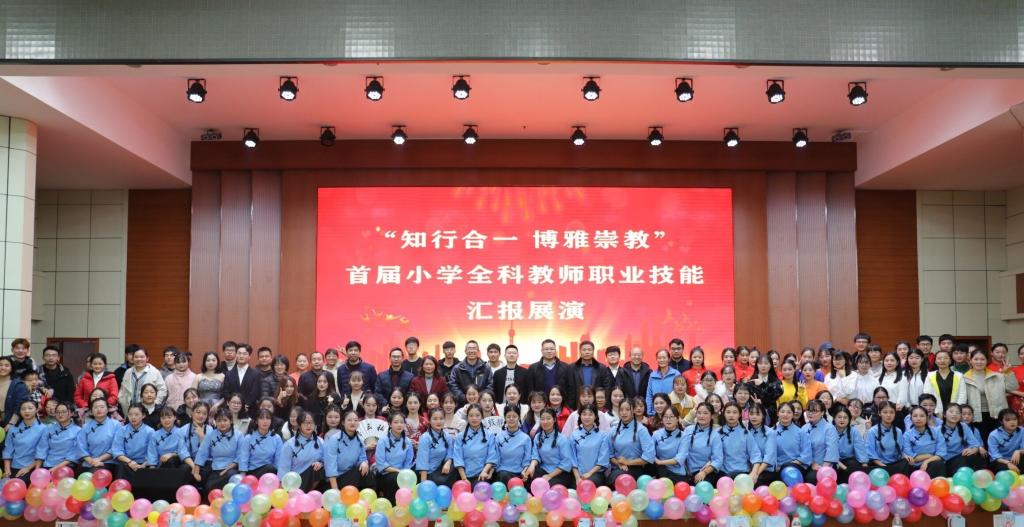 为深入贯彻全国教育工作大会和《中共中央国务院关于全面深化新时代教师队伍建设改革的意见》精神,大力落实国家《教师教育振兴行动计划(2018-2022年)》要求,真正达到小学教师一专多能的培养目标。12月13日晚,由教师教育学院行知教育工作室、教师教育学院团委主办的“知行合一,博雅崇教”首届小学全科教师职业技能汇报展演在逸夫楼报告厅举行。信阳师范学院教务处朱明老师、校团委张锐老师、教师教育学院付永昌院长及全体老师与四百多名学生共同观看本次展演。