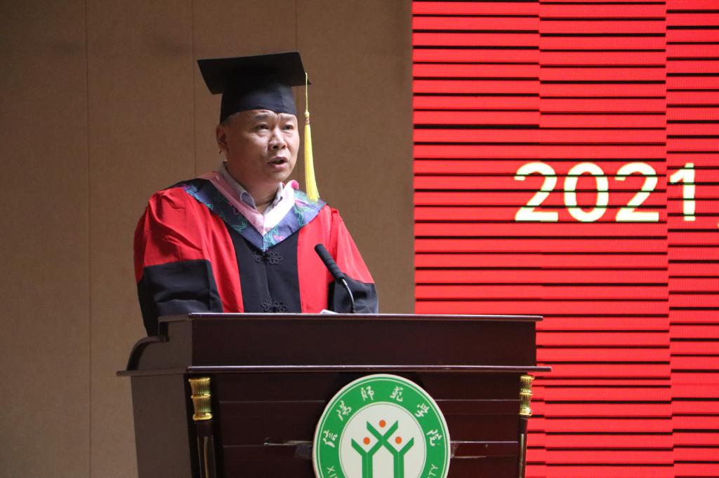 毕业典礼仪式在高亢嘹亮的国歌声中拉开序幕。首先,付永昌教授宣读了学校学位评定委员会关于授予教师教育学院189名2021届普通本科小学教育专业毕业生教育学学位的决定并发表致辞。他表示,2017年,怀揣赤子之心的学生和以红色筑梦为依托、立足大别山革命老区乡村教师培育的教师教育学院相拥而至。四年来,学生与学院同步伐、共命运,见证着彼此的点滴成长。在最后的离别之际,他向毕业生提出三点建议。第一,永葆初心、砥砺恒心,始终对教师怀有尊敬情怀。第二,天下大事、必作于细,扎实学识,做专业之才。第三,青年向上、国家向前,对未来职业道路充满期待,奋发向上。