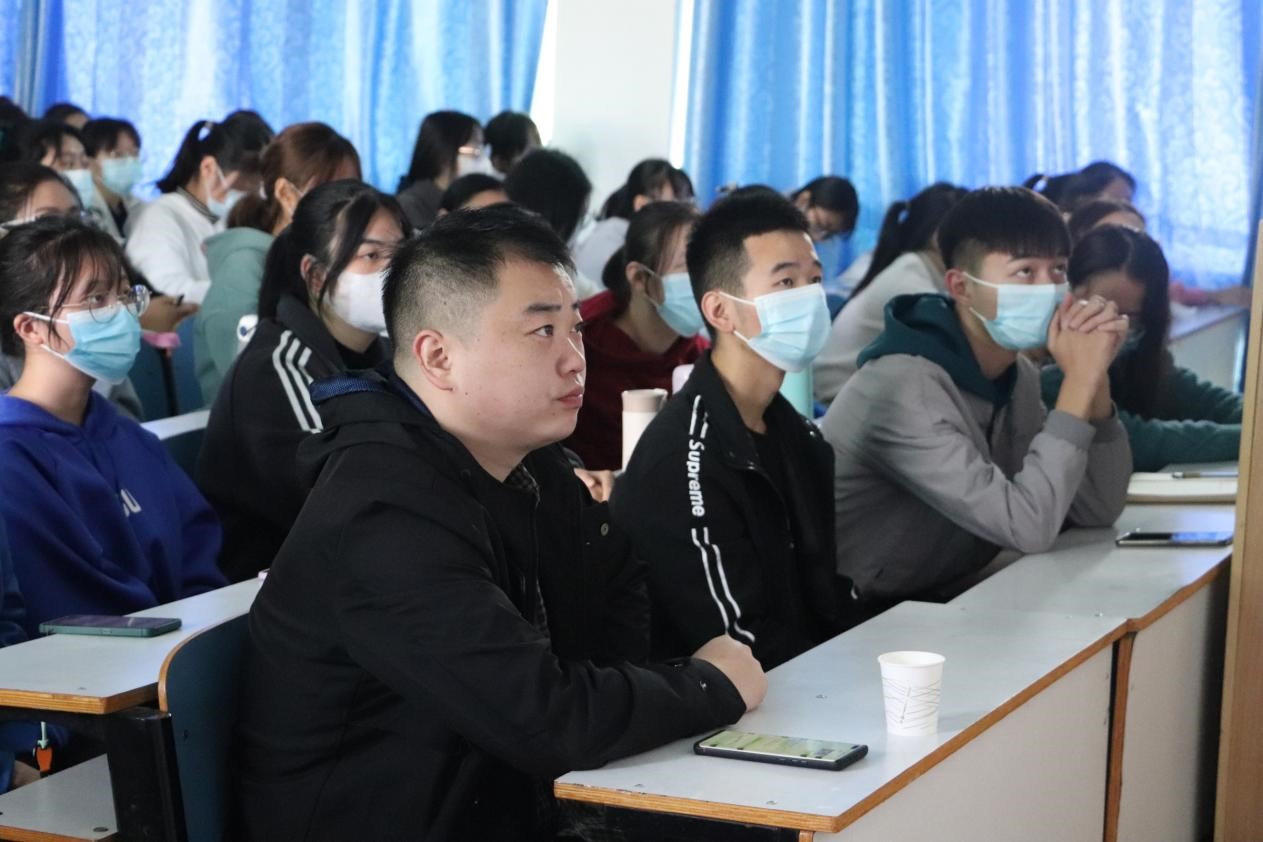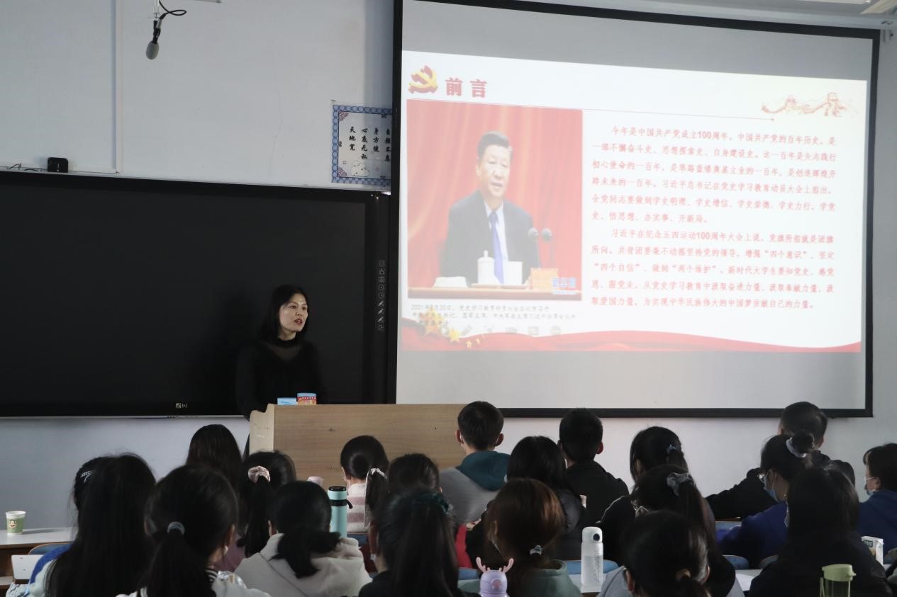 接着,王艳蕊以《知党史、感党恩、跟党走》为题,以中国共产党百年华诞为切入点,分三个方面详细阐述。一是坚定理想信念,时刻不忘知党史。她围绕学习党史的现实意义向同学们介绍了党的发展和时间脉络,并鼓励同学们认真学习,坚定社会主义信念,凝聚发展共识;二是补足精神之钙,时刻不忘感党恩。王艳蕊立足于中国共产党成立的重要意义,从中国共产党秉承为人民服务的宗旨展开分析,呼吁同学们不忘初心,牢记使命,要为实现中华民族伟大复兴而奋斗。三是听党话、跟党走,与祖国共成长。王艳蕊以防汛抗疫中青年学子展现的“天下兴亡,匹夫有责”的大义担当事迹为例,希望同学们能够增强志气、骨气、底气,不负时代,不负韶华,不负期望,请党放心,强国有我们。