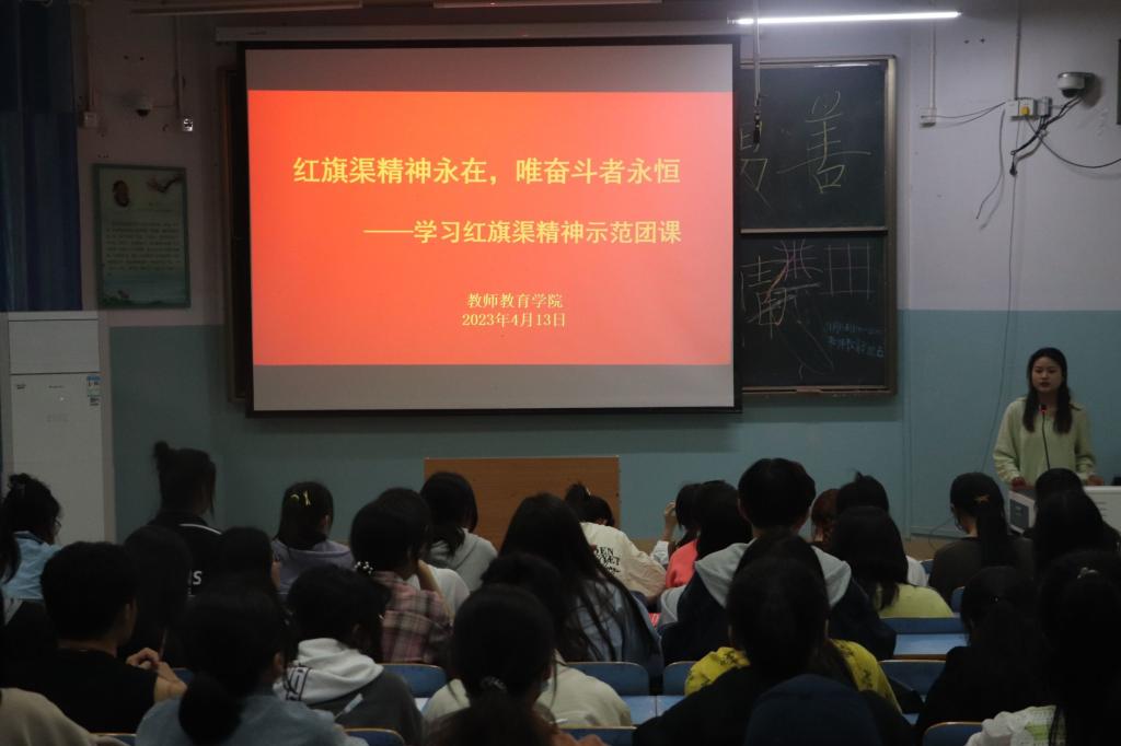 为学习党的二十大精神,落实习近平总书记关于青年工作的重要思想,深入贯彻习近平总书记视察河南重要讲话重要指示,4月13日,教师教育学院于教九楼205开展学习红旗渠精神示范团课,本次团课围绕“红旗渠精神永在,唯奋斗者永恒”的主题开展,团课由刘雪主持。