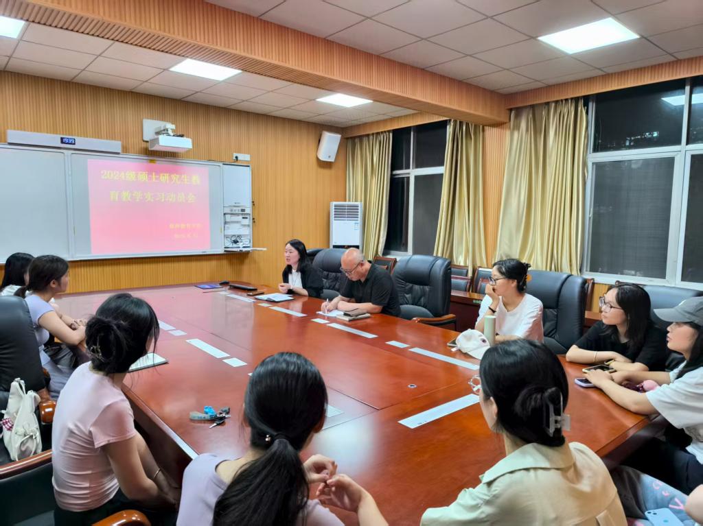 为扎实推进研究生实践育人环节,助力2024级小学教育专业硕士研究生实现从“理论学习者”到“实践教学者”的角色转变,保障校外实习工作高质量落地,8月31日下午,教师教育学院在教七楼301会议室组织召开2024级小学教育专业硕士研究生校外实习动员会。本次会议由学院院长李文田主持,研究生秘书兼班主任常燕燕老师及2024级小学教育专业全体硕士研究生参会。