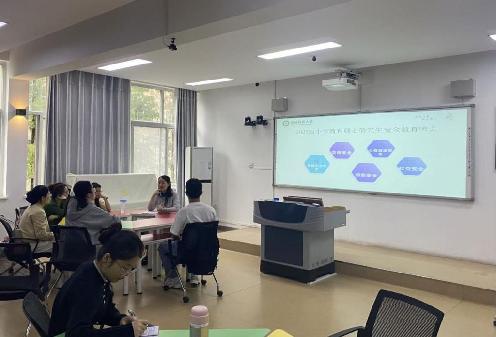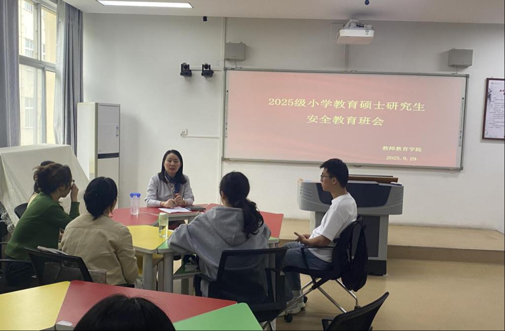 为切实加强研究生安全防范意识,帮助新生快速树立安全观念、筑牢校园安全防线。9月29日下午,教师教育学院在教七楼402室召开安全教育主题班会,班会由研究生秘书兼辅导员常燕燕主持,2025级全体研究生参加。