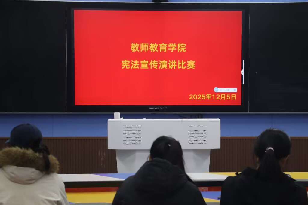 比赛现场气氛热烈,十二位参赛者依次登台宣讲。他们精神饱满、意气昂扬,紧扣宪法主题生动阐述观点,每位参赛者均怀揣独到见解,以坚定态度呼吁大家学习宪法。宣讲中,参赛者将演讲内容与个人见解融入一张张幻灯片,以声传意、以图释理,清晰解读宪法核心要义,传递宪法的力量与温度,充分展现出教师教育学院学子对宪法的尊崇敬畏与践行决心,他们的精彩表现赢得现场阵阵掌声。最后,评委团围绕演讲内容深度、语言表达流畅度、情绪感染力及仪容仪态等维度严谨评分,公平公正评选出优秀选手。