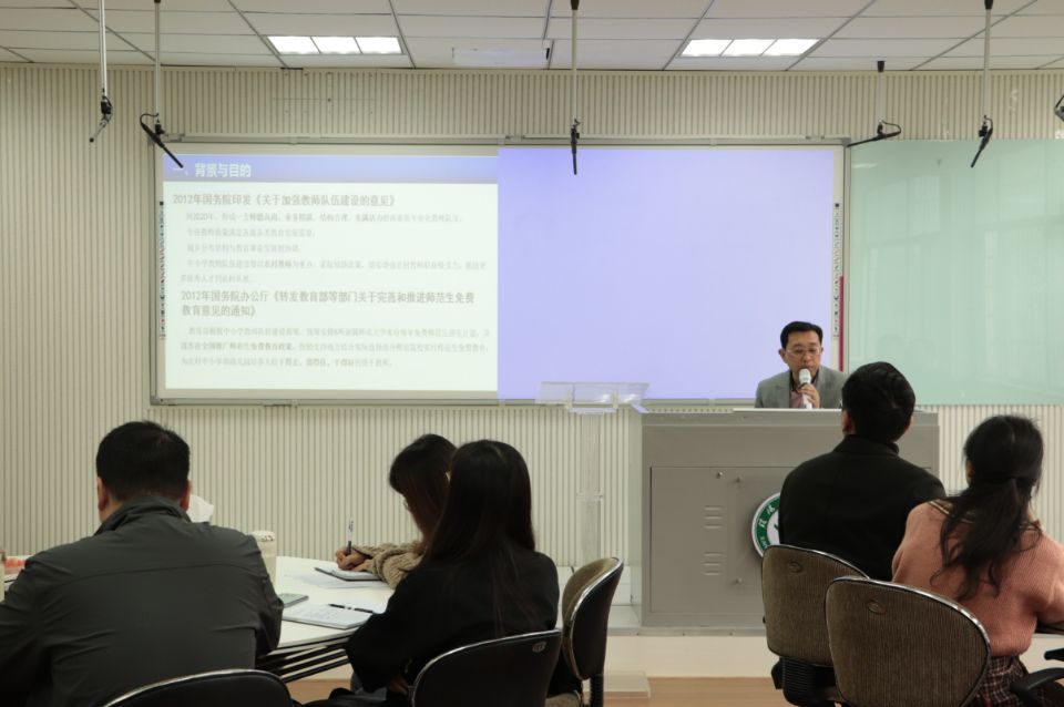 为进一步探讨学校对公费师范生的培养与管理模式,加强学校各院对学院小学全科教师的认识,11月5日,教师教育学院于教七楼教师教育发展中心举行“公费师范生培养与管理——以小学教育全科教师为例”主题讲座,马克思主义学院、化学化工学院、地理科学学院、音乐与舞蹈学院、体育学院和教师教育学院五个学院党委副书记及辅导员出席此次讲座。学院党委副书记潘登主持会议。