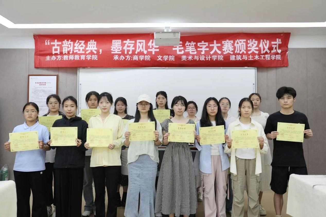 5月9日,由教师教育学院行知教育工作室,习乐学社主办的“古韵诗词,墨存风华”毛笔字书写大赛颁奖仪式在教七楼201教室顺利举行,习乐学社工作人员及本次大赛获奖者共同参加此次颁奖仪式。
